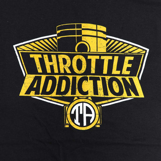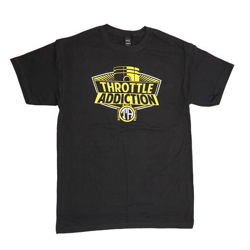 This black 100% cotton T-Shirt is printed in Eau Claire WI. It features our signature Throttle Addiction piston logo.  Printed in the USA