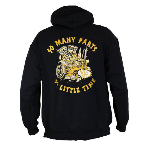Black midweight hoodie with so many parts logo on back and classic ChopCult logo on front.  Printed in the USA